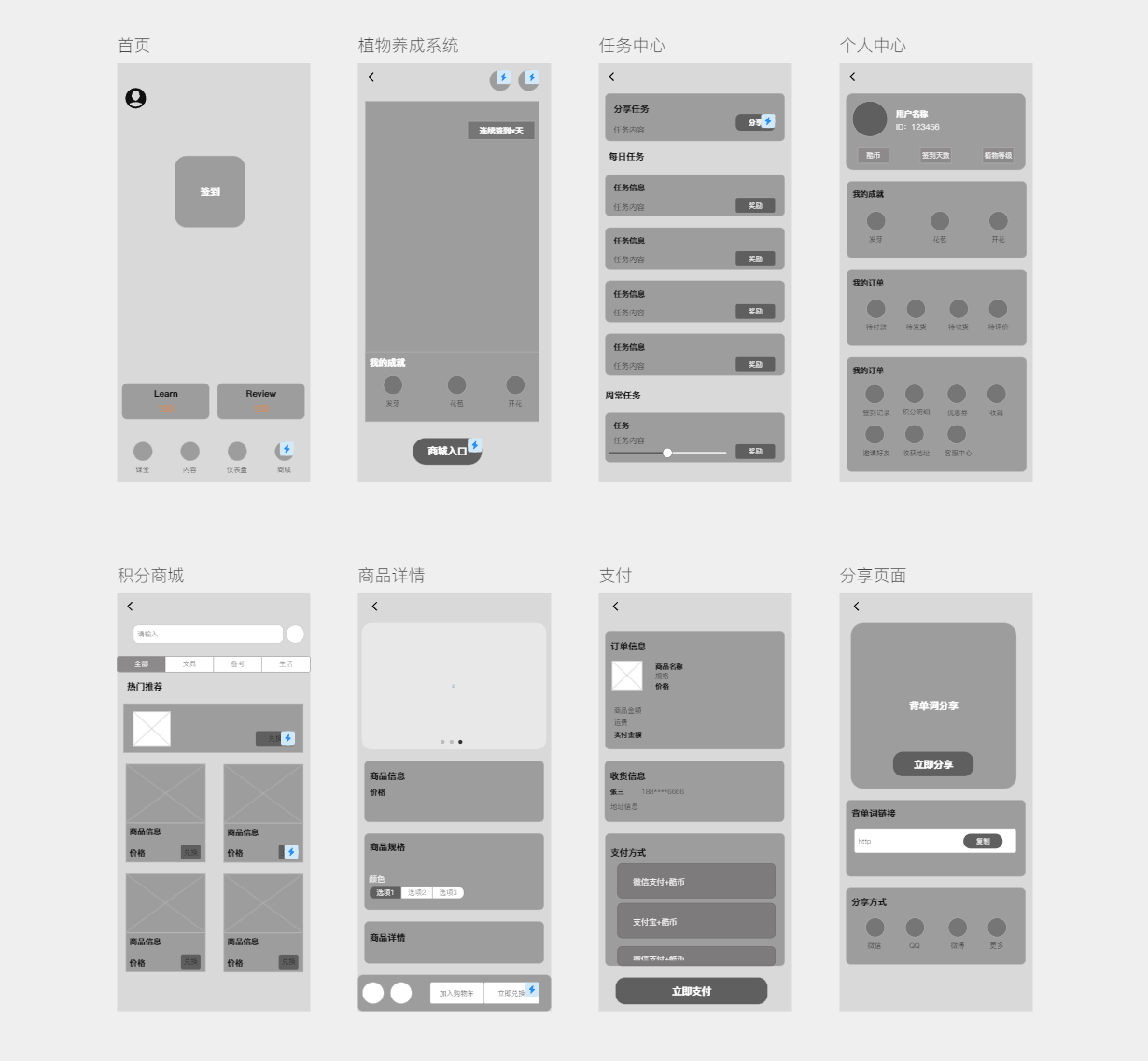 展示用户从登录 → 做任务 → 浇水 → 植物成长 → 积分获取 → 商城兑换的完整流程